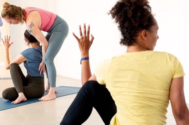 Im Verlauf des Programms werden die einzelnen Asanas und Vinyasas, also die verbindenden Bewegungselemente, und Adaptationen oder Varianten geübt und besprochen.